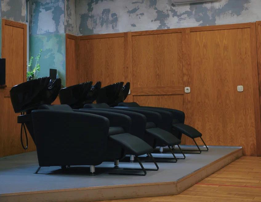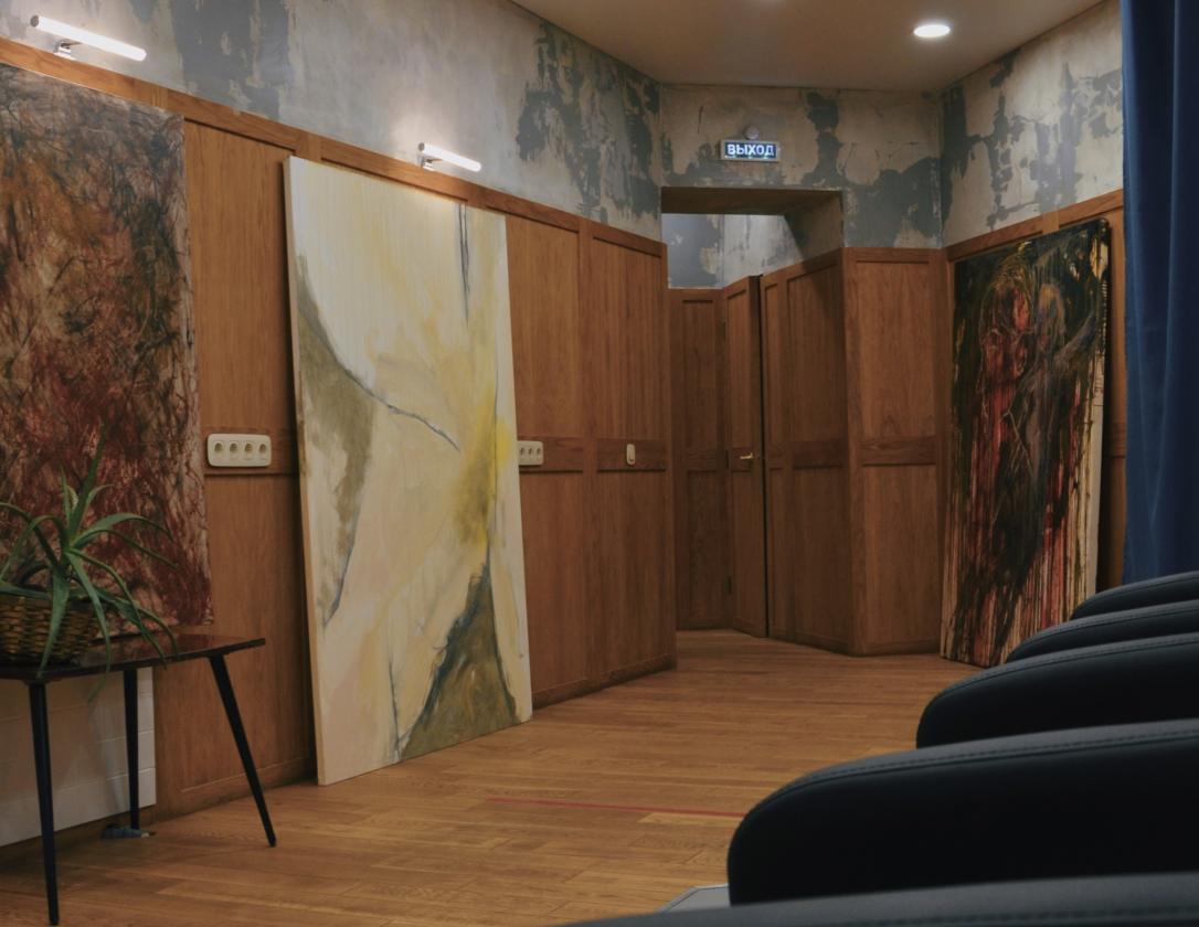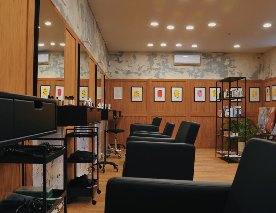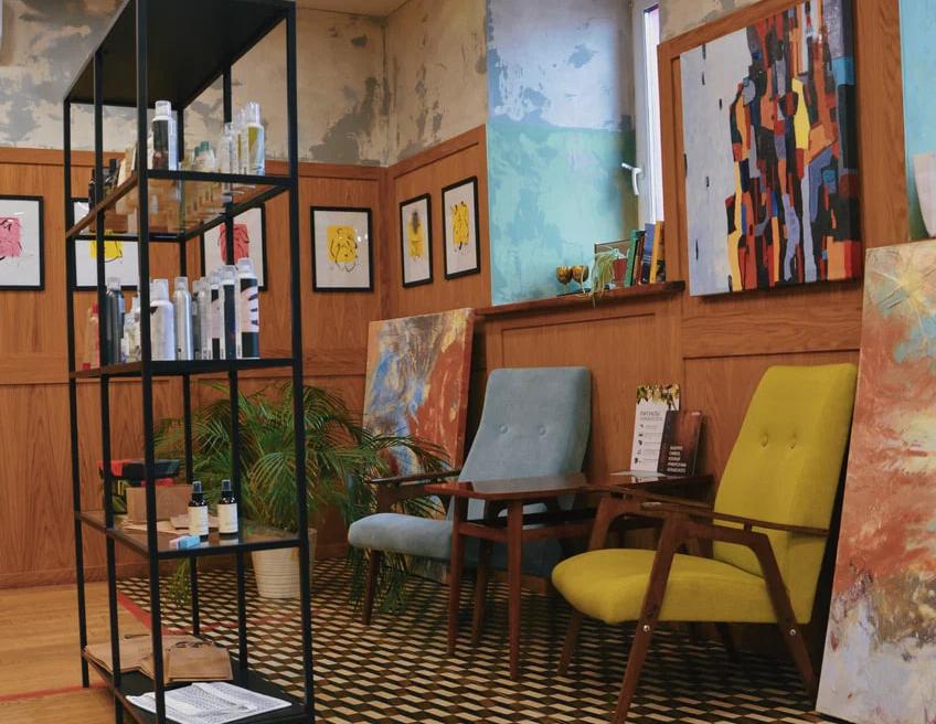 Творческое объединение с парикмахерской, минибаром и выставкой картин.