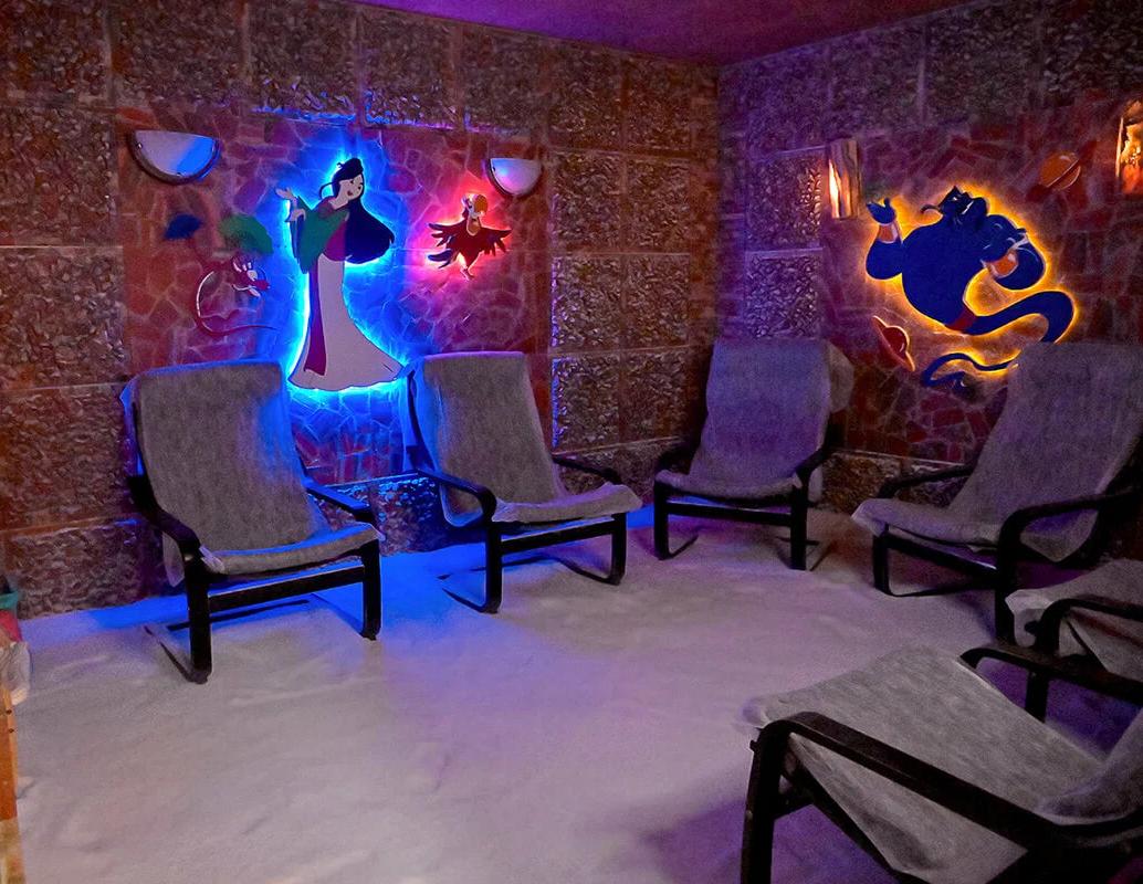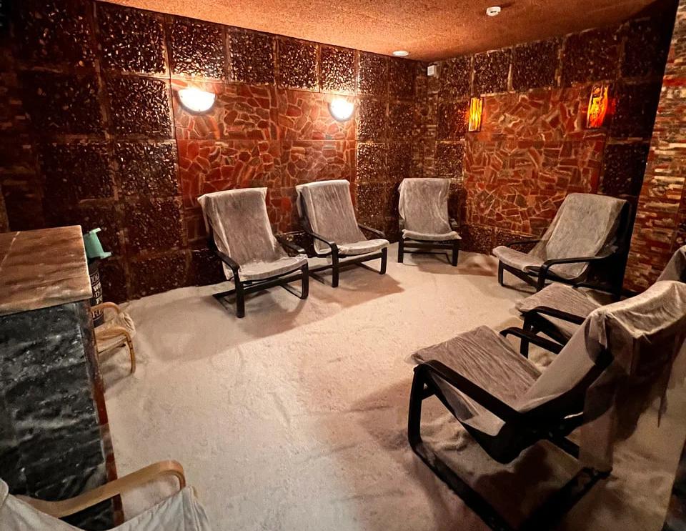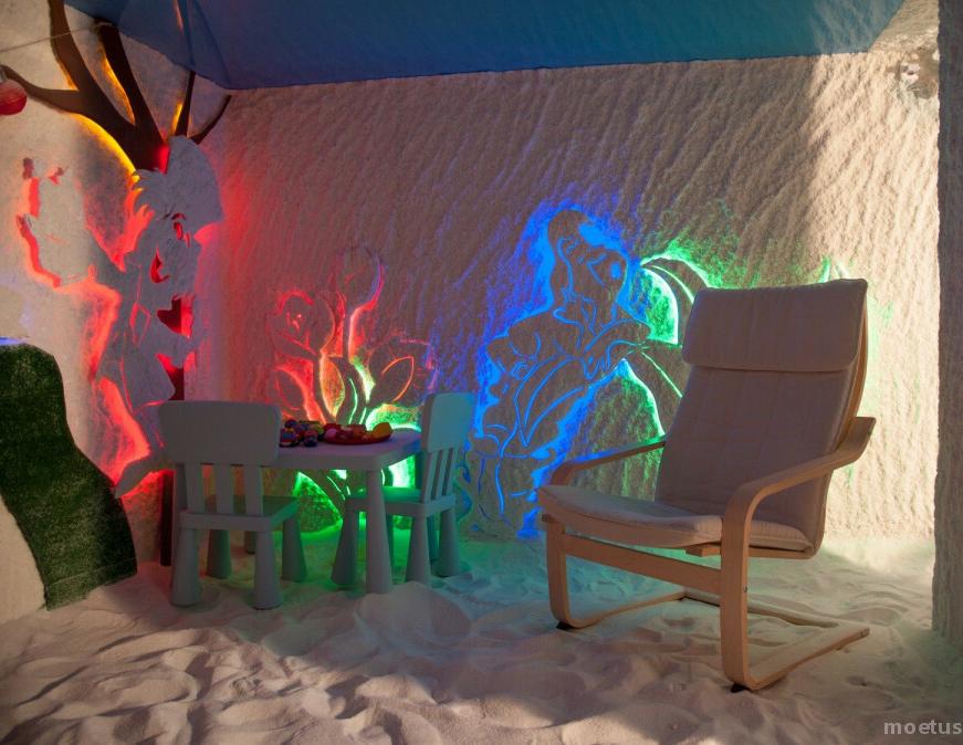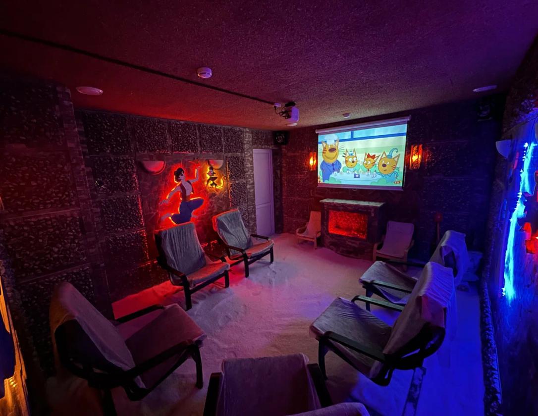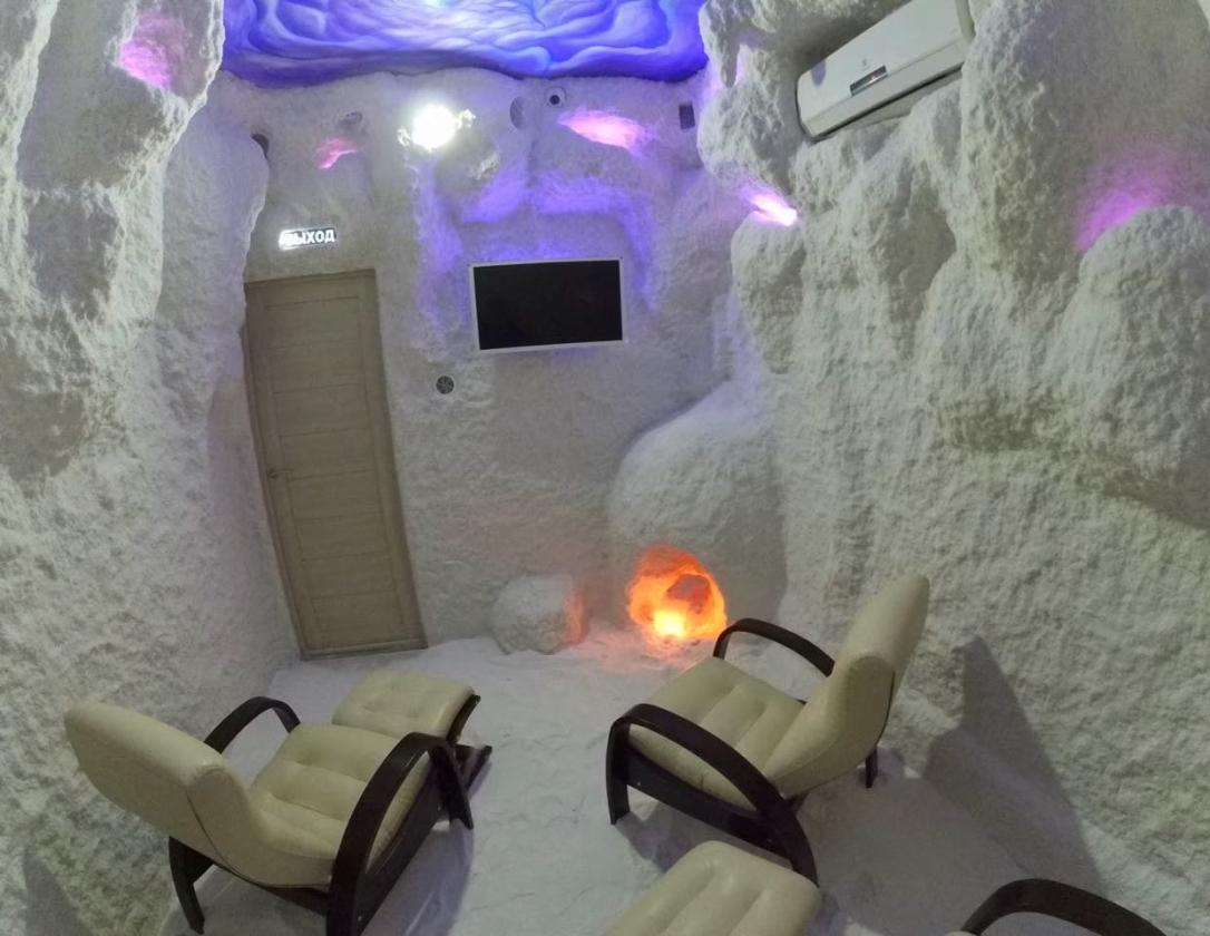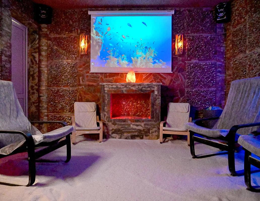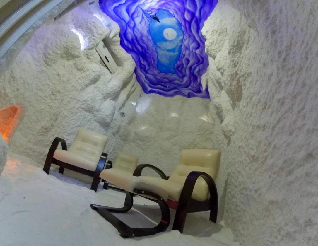 Соляная пещера - специально оборудованное помещение с удобными релаксационными креслами. На стены и пол нанесено специальное толстое солевое покрытие, а воздух насыщен аэрозолем хлорида натрия (соли).