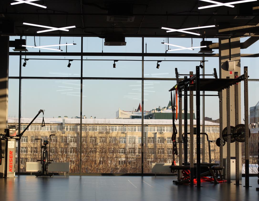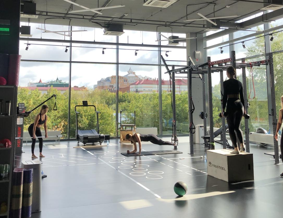 Просторный клуб с зонированием на двух этажах. В распоряжении посетителей тренажерный зал с зоной кроссфита, кардиозона с панорамными витражными окнами, зона сайкла с экраном и два групповых зала. Предусмотрены места для растяжки, детский коворкинг для занятий и игр, бар с готовым питанием и спортивными добавками. После тренировки доступны раздевалки с душевыми, массажный кабинет. На этажах установлены пурифаеры воздуха. Клуб располагает просторной парковкой и оборудованной площадкой для уличных тренировок. Ценность — доступный формат посещения, ориентир на результат.